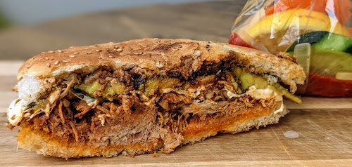 That includes the cemita de pierna enchilada ($9, below), shredded pork leg cooked in a spicy adobada. This always seems to be delicious on tortas and cemitas, and here they make it just about perfectly. It is with joy that future visits to this particular section of the Boyle Heights-East Los border are looked forward to for many of their other cemitas. Has anyone tried another option that they recommend?